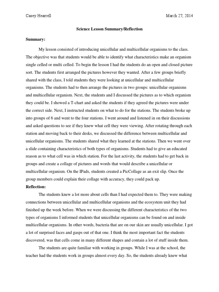 Science Lesson Reflection | PDF | Cell (Biology) | Organisms