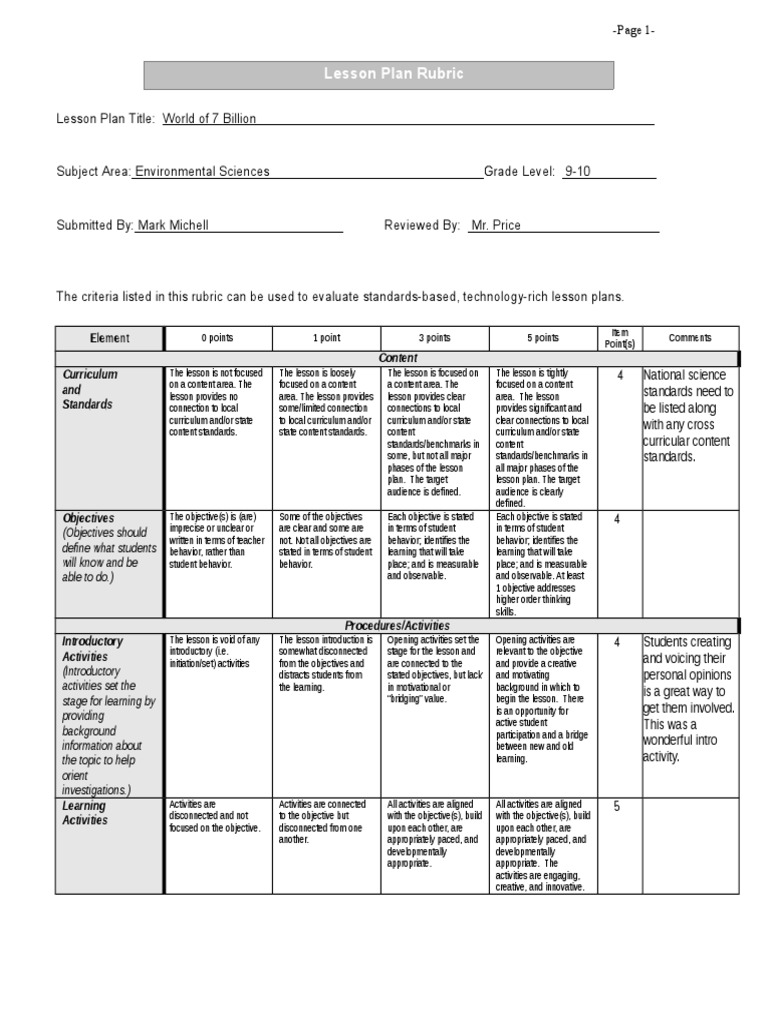 Lesson Plan Rubric Teaching Associate Name Grade | PDF | Lesson Plan ...