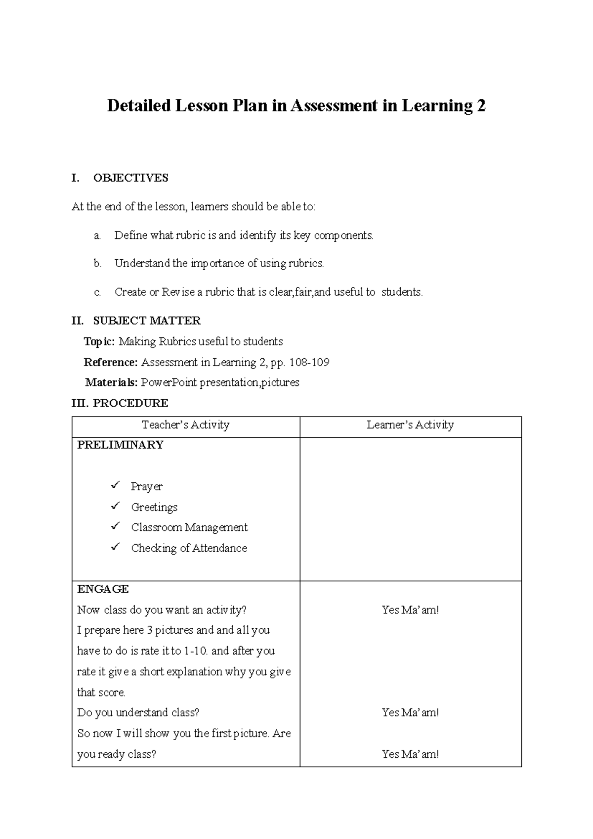 Detailed Lesson Plan: Making Rubrics Useful in Assessment in Learning 2 ...
