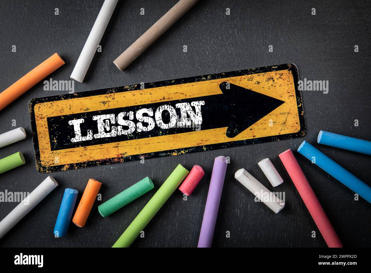 Lesson. Direction arrow with text on a dark chalkboard background Stock ...