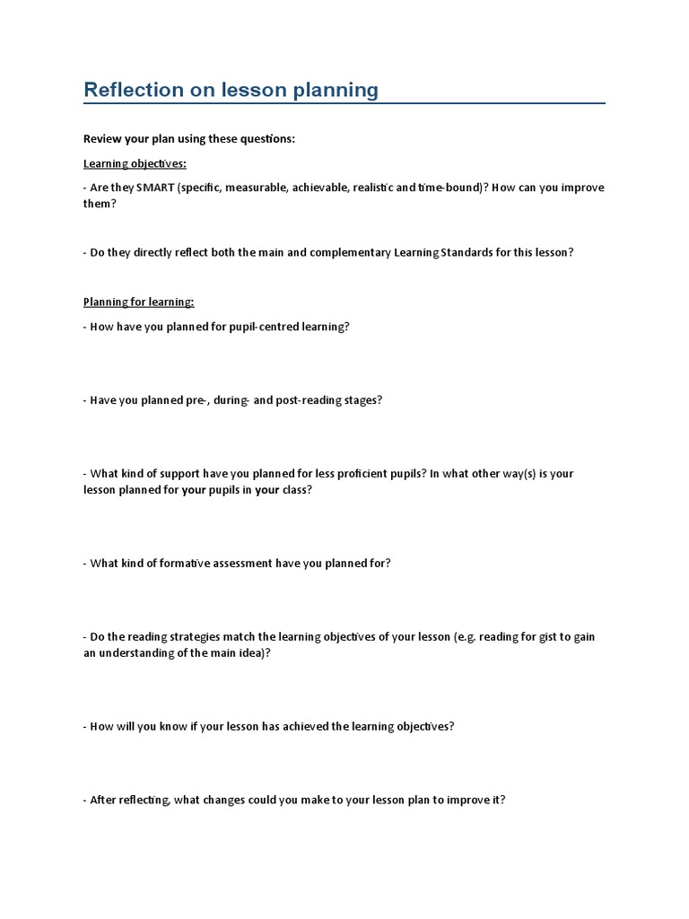 Reflection On Lesson Planning: Review Your Plan Using These Questions | PDF