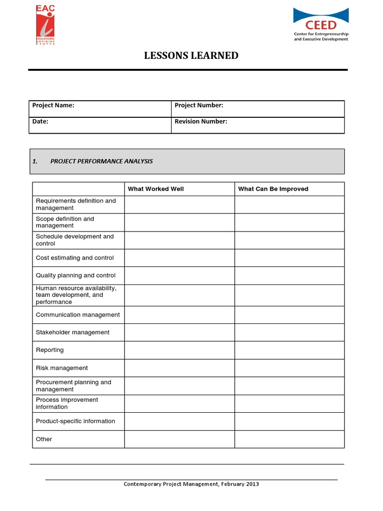 Project Lesson Learned Sample Free Download