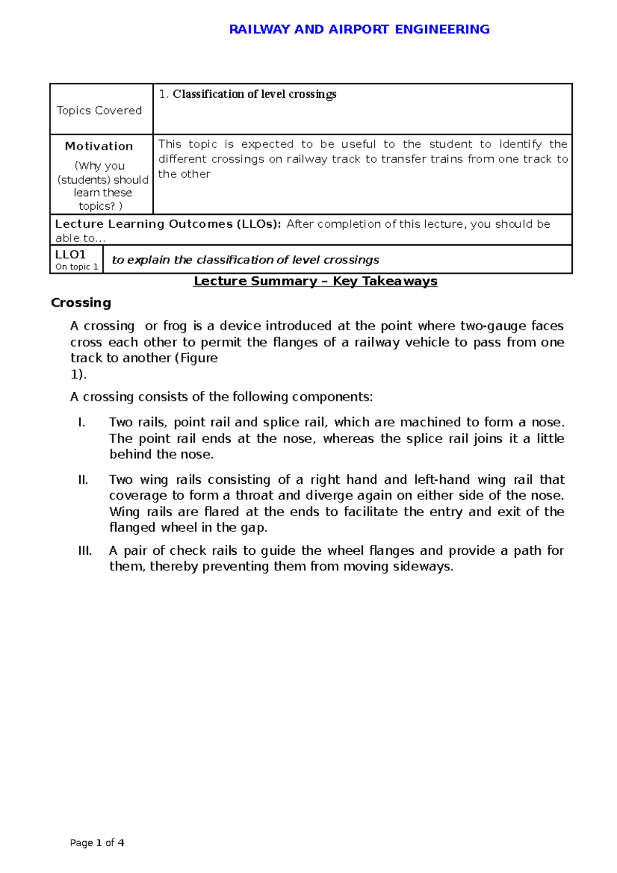 Classification of level crossings - Topics Covered 1. Classification of ...