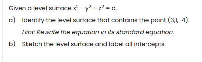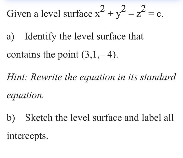 Solved Given a level surface x2 - y2 + z2 = c. a) Identify | Chegg.com