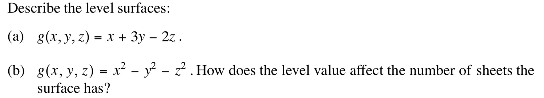 Solved For each function, descibe the level surfaces.(a) | Chegg.com