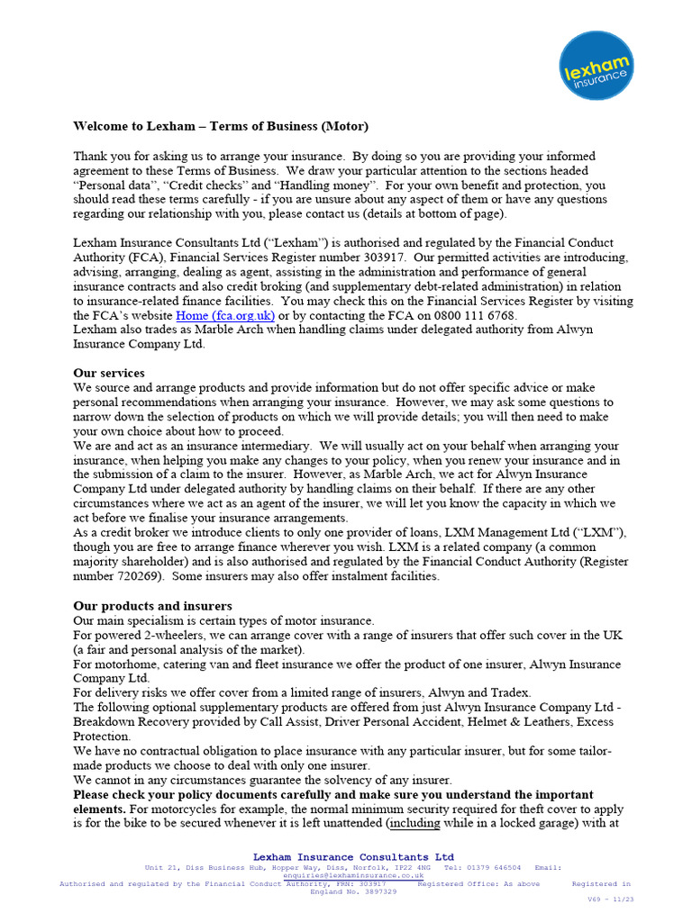 Lexham Insurance Terms of Business | PDF | Insurance | Vehicle Insurance