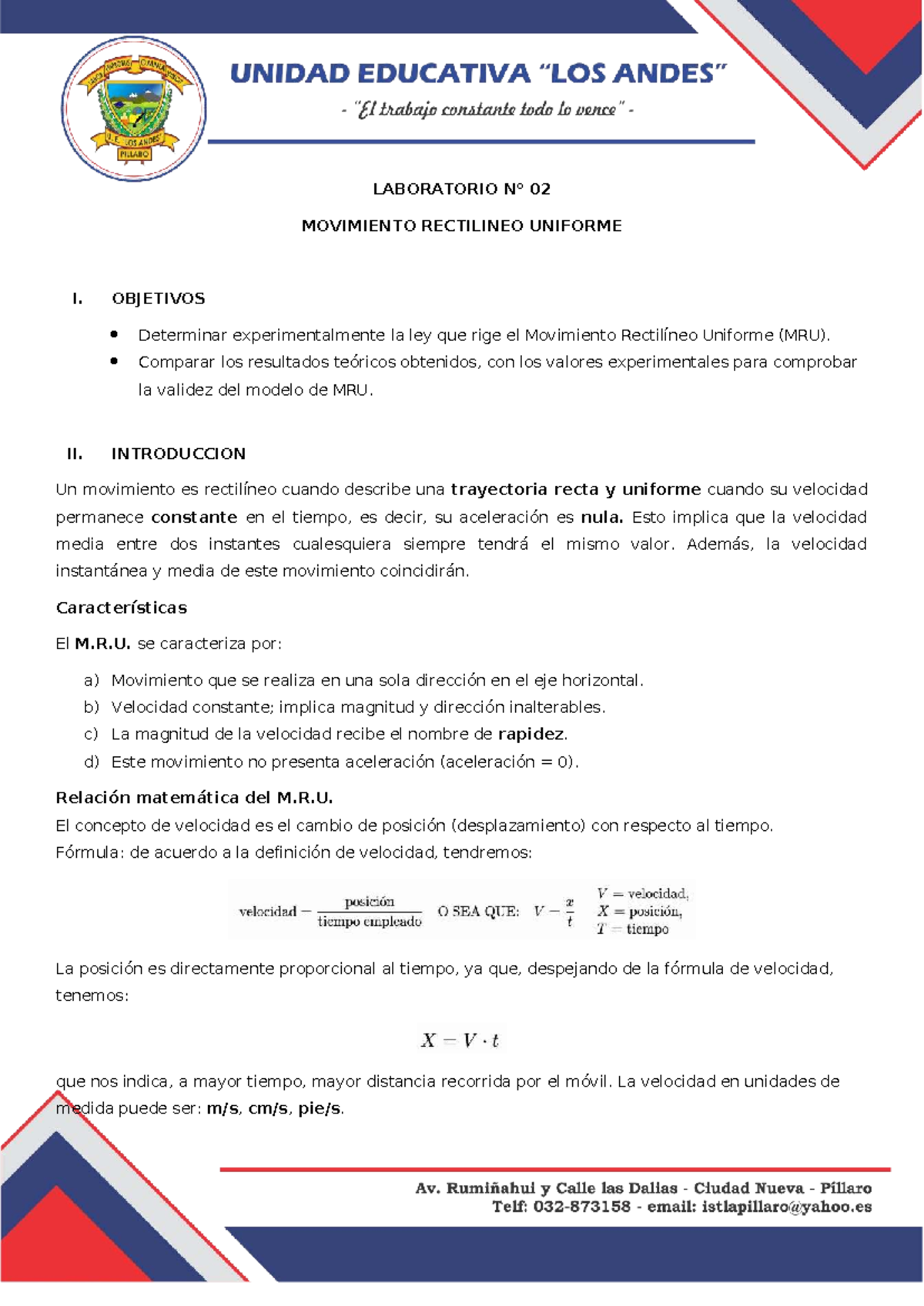 LAB 02: Movimiento Rectilíneo Uniforme - Objetivos y Experimentos - Studocu