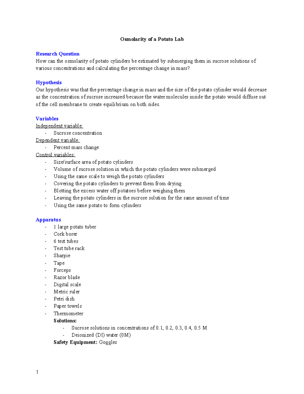 Osmolarity Lab: Estimating Potato Cylinder Mass Change in Sucrose ...