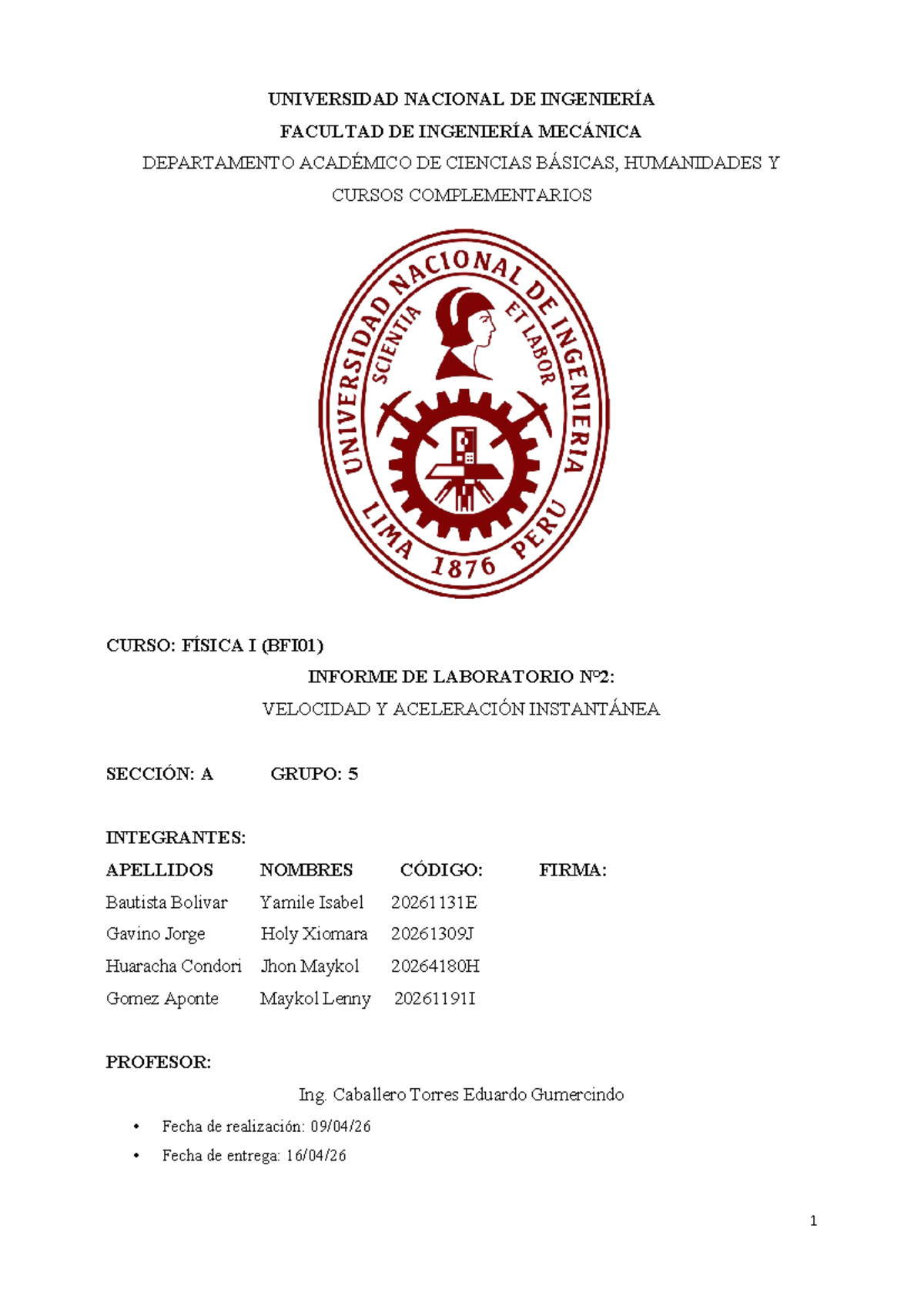 Informe de Lab 02: Velocidad y Aceleración Instantánea (BFI01) - Studocu