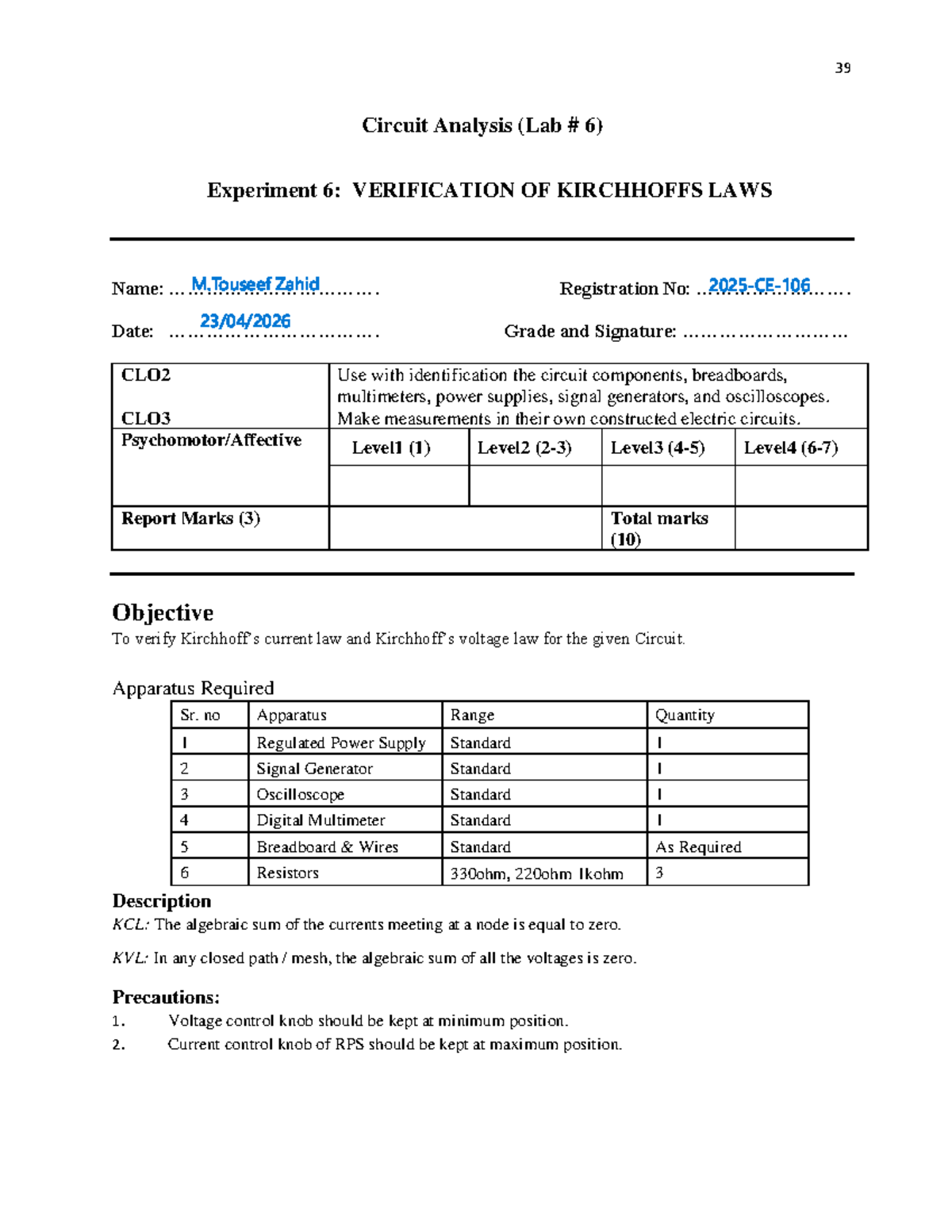 CA 39 Lab #6: Verification of Kirchhoff's Laws Experiment - Studocu