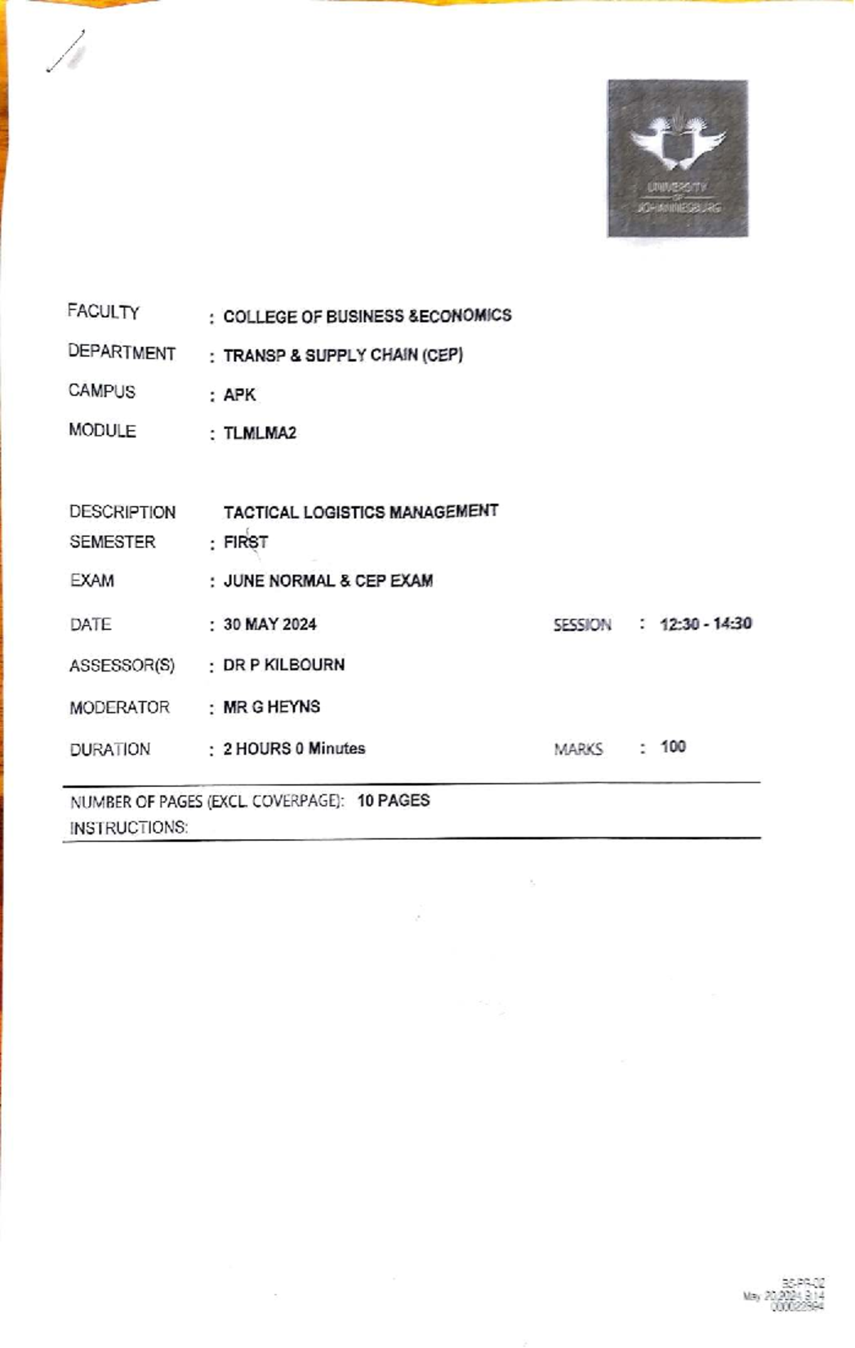 TLMLMA2 Final Exam - Tactical Logistics Management - Studocu