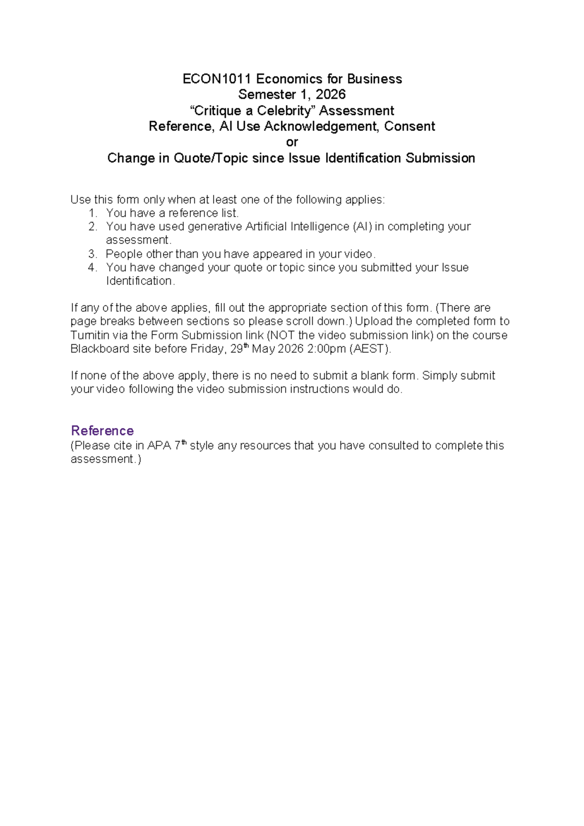ECON1011 Assessment Reference: AI Use Acknowledgement Form - Studocu