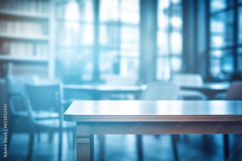 Wooden table in the library with a blurred bookshelf with many book in ...