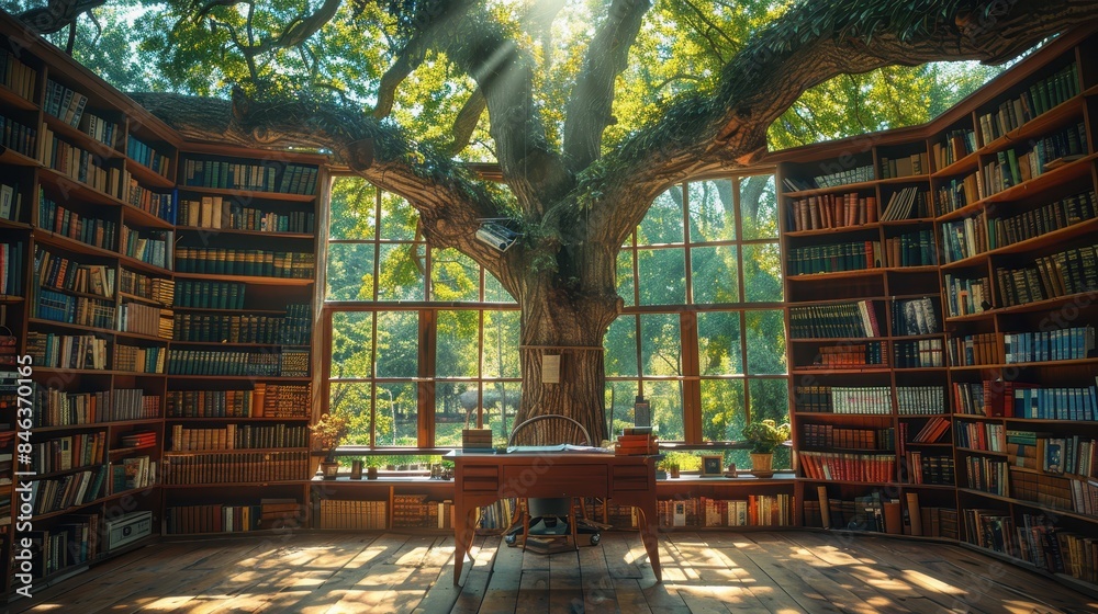 Premium Photo | A beautiful library with a large tree growing in the ...