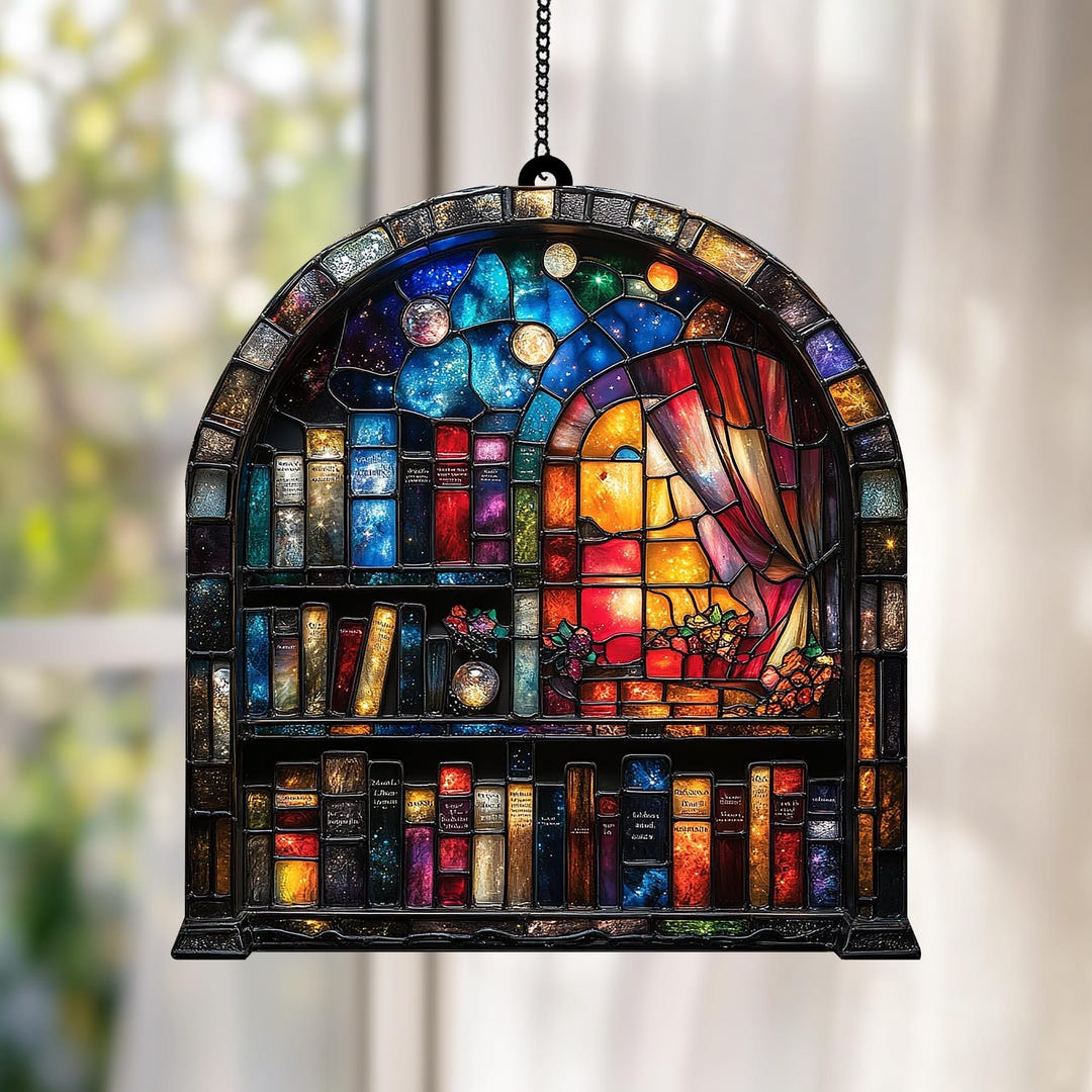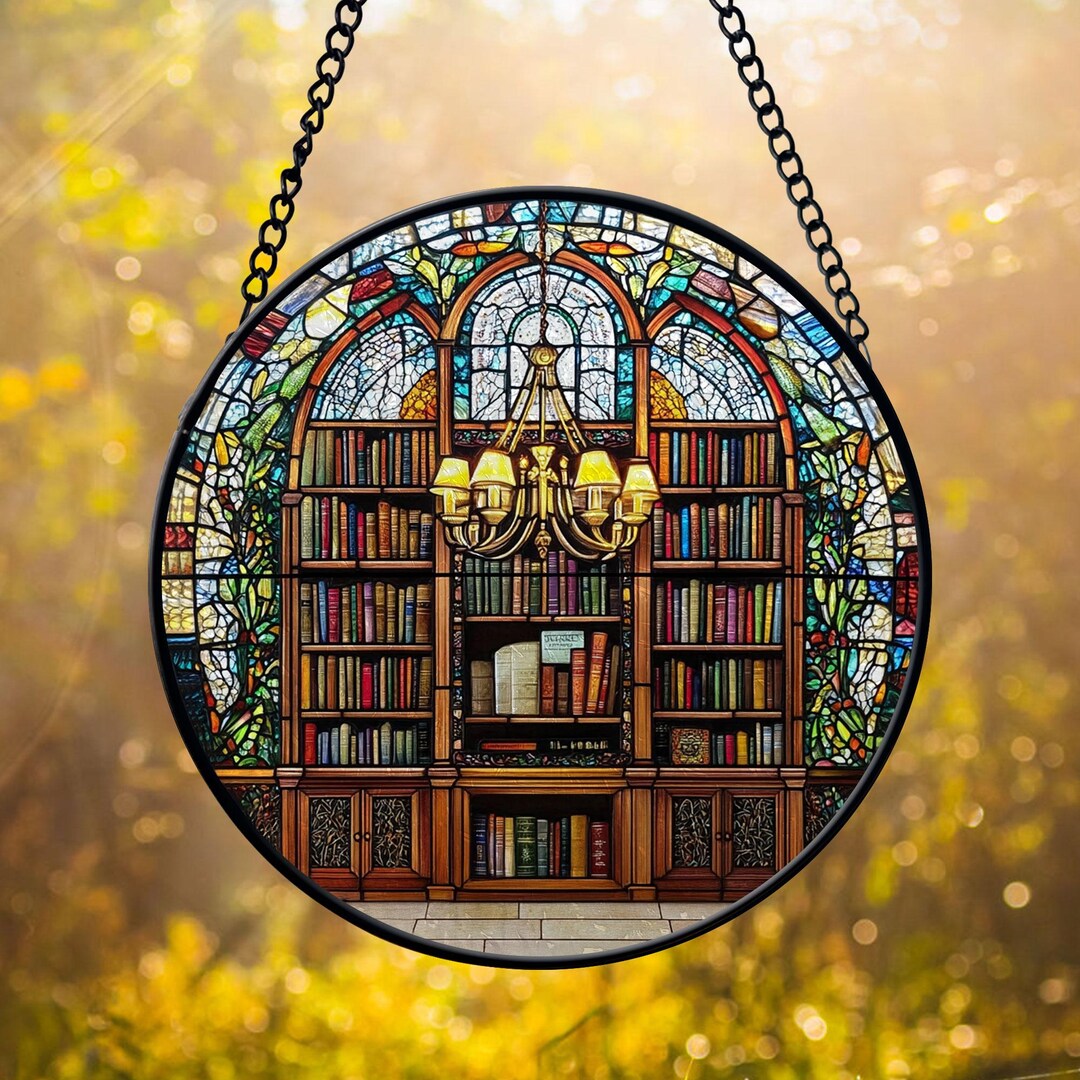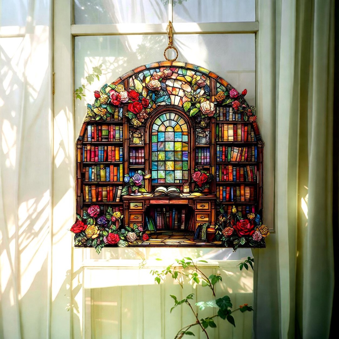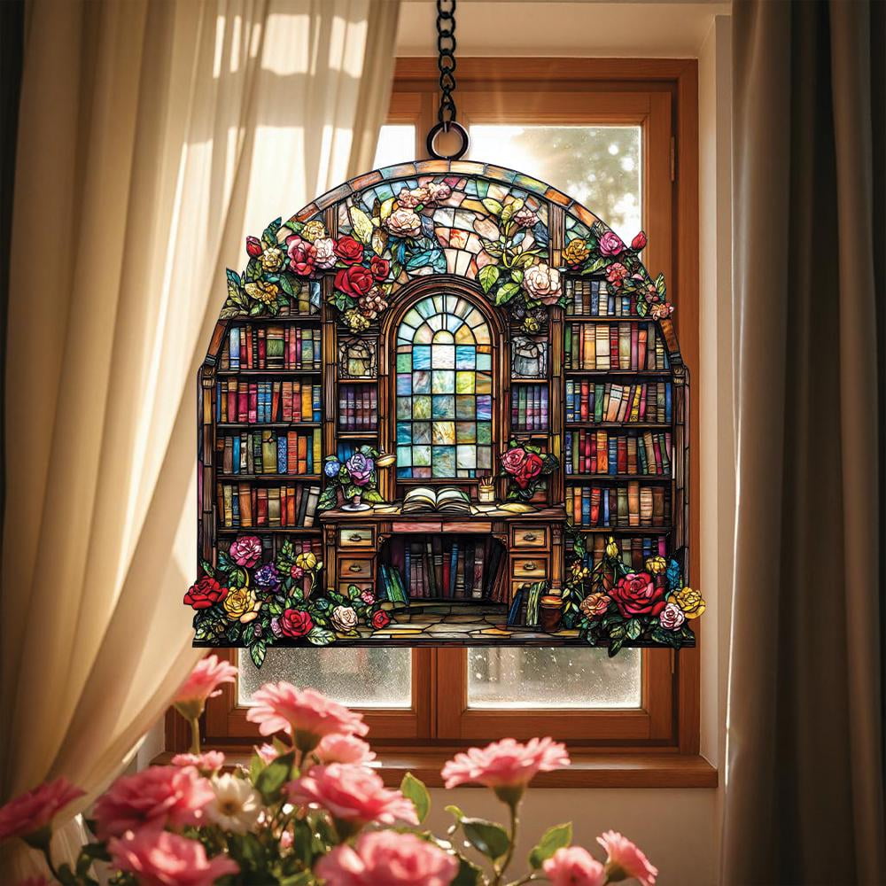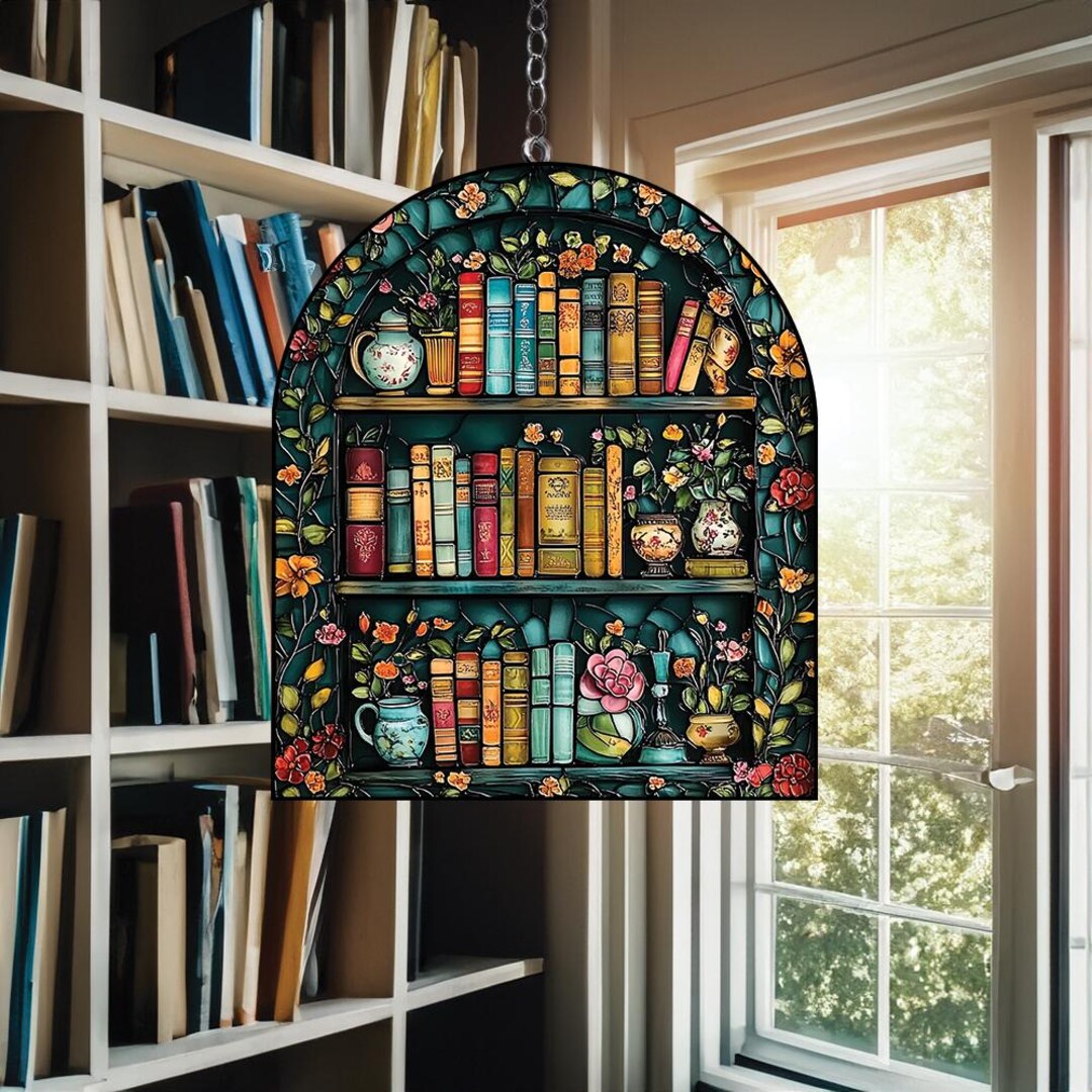 Book Lover Library Bookshelf Suncatcher, Acrylic Faux Stained Glass ...