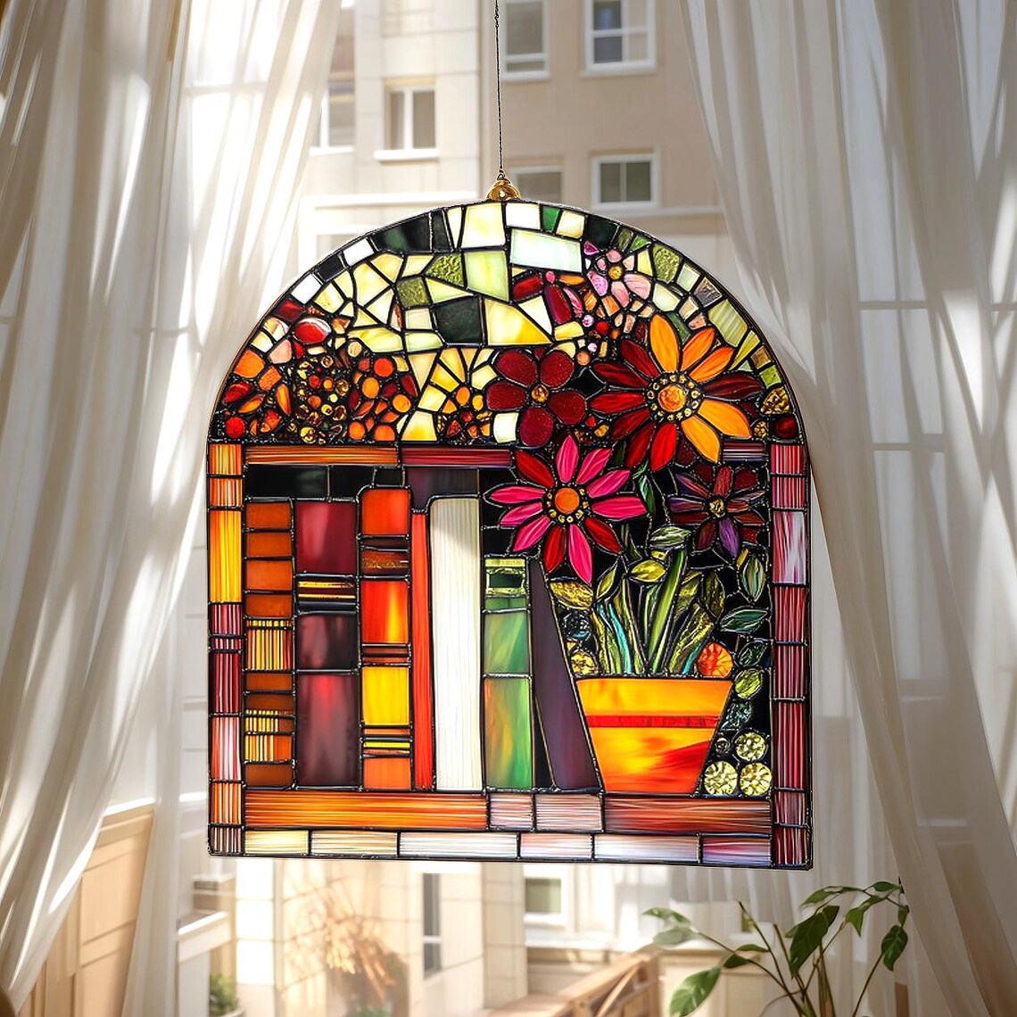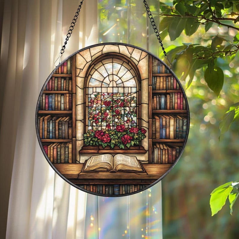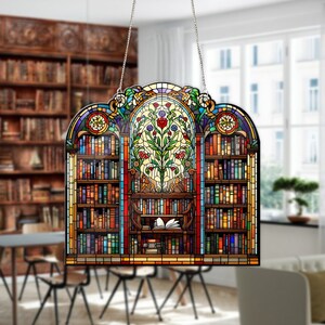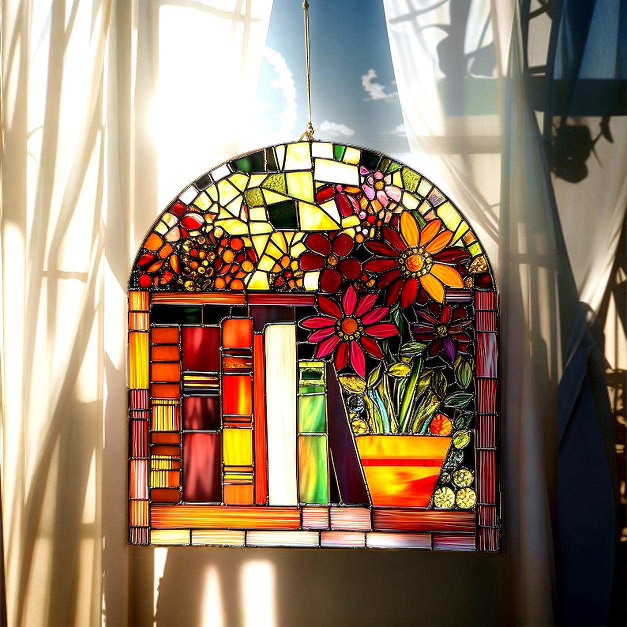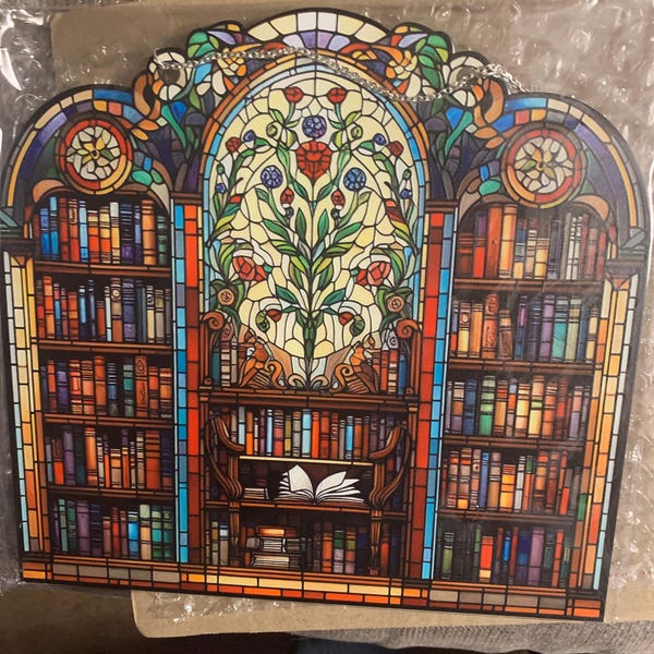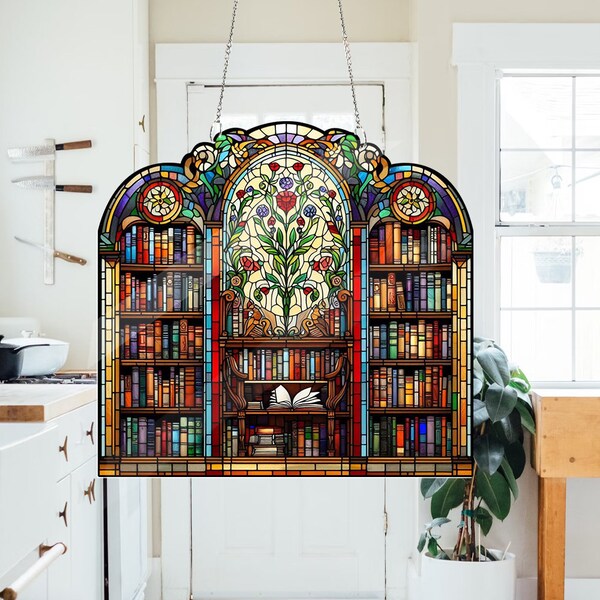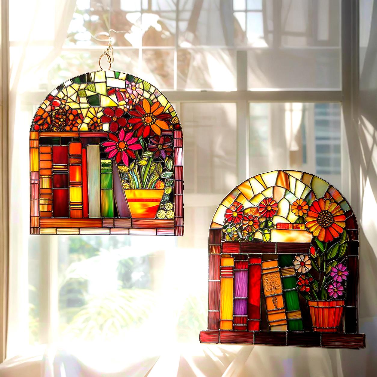 Book Lover Library Bookshelf Suncatcher, Acrylic Faux Stained Glass ...
