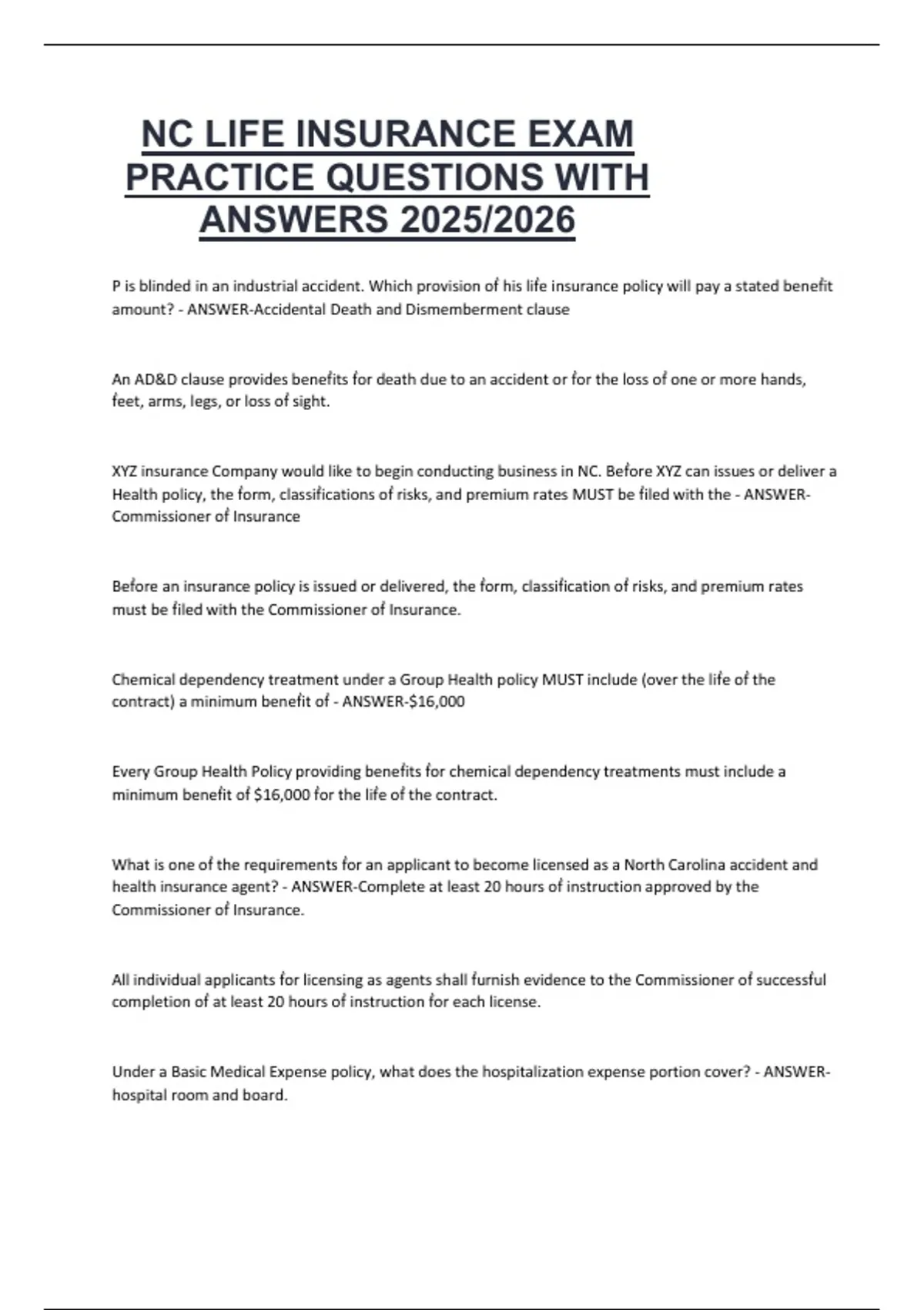 NC LIFE INSURANCE EXAM PRACTICE QUESTIONS WITH ANSWERS 2025/2026 - NC ...