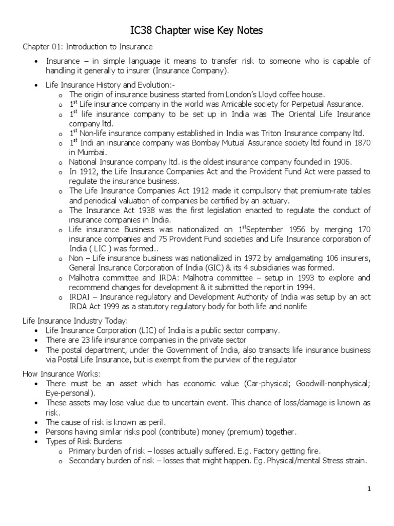 IC38 Chapter Wise Key Notes | PDF | Life Insurance | Insurance