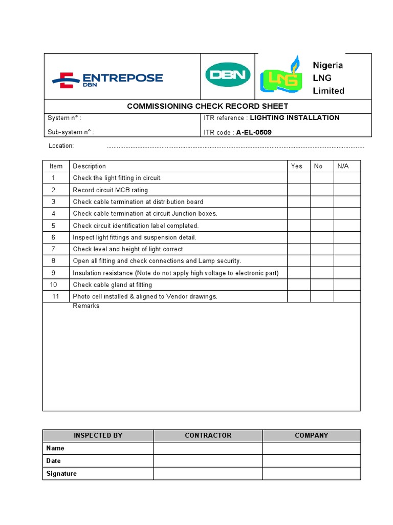 Inspection Test Sheet - ITS-E24 - Lighting Installation - Workplace ...