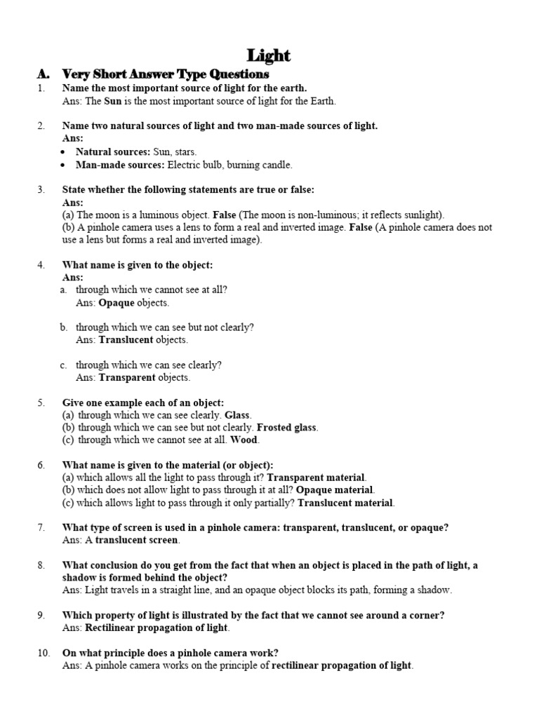 Light Quetion and answer | PDF | Shadow | Reflection (Physics)