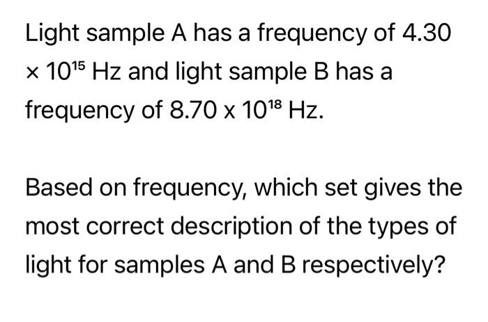 Solved Light sample A has a frequency of 4.30×1015 Hz and | Chegg.com