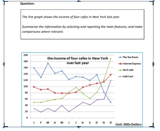 Band 8: The line graph shows the income of four cafes in New York last ...