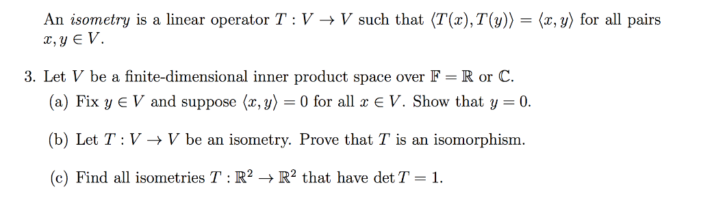 Solved An isometry is a linear operator T: V -> V such that | Chegg.com