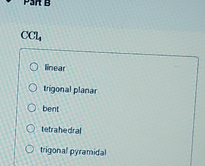 Solved: CCl_4 linear trigonal planar bent tetrahedral trigonal ...