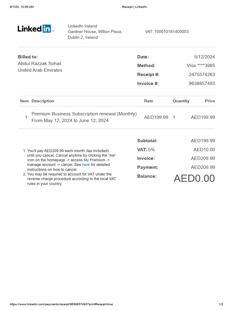 LinkedIn Premium Subscription Invoice | PDF | Receipt | Value Added Tax