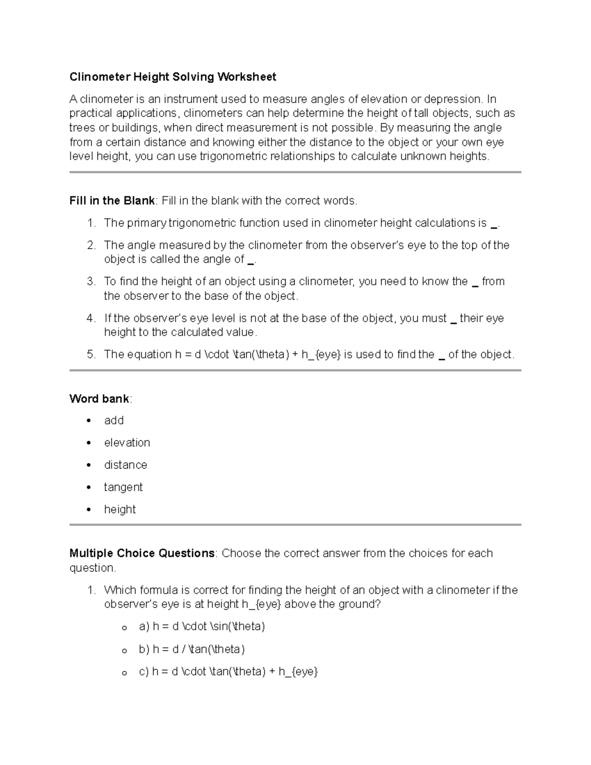 Clinometer Height Calculation Worksheet: Trigonometric Applications ...