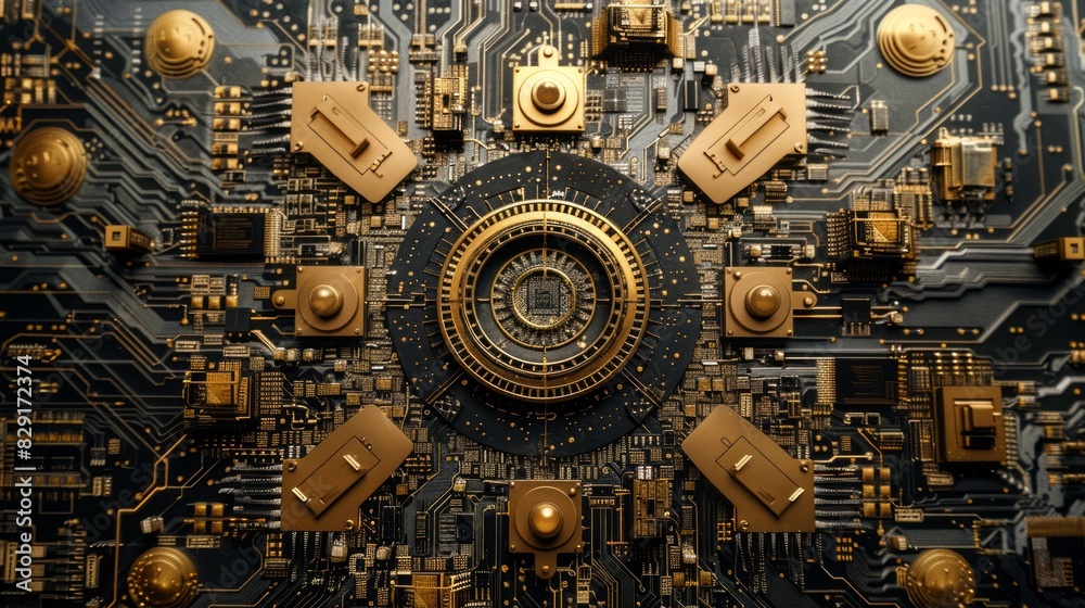 Highly detailed, large-scale high-tech printed circuit board image. The ...