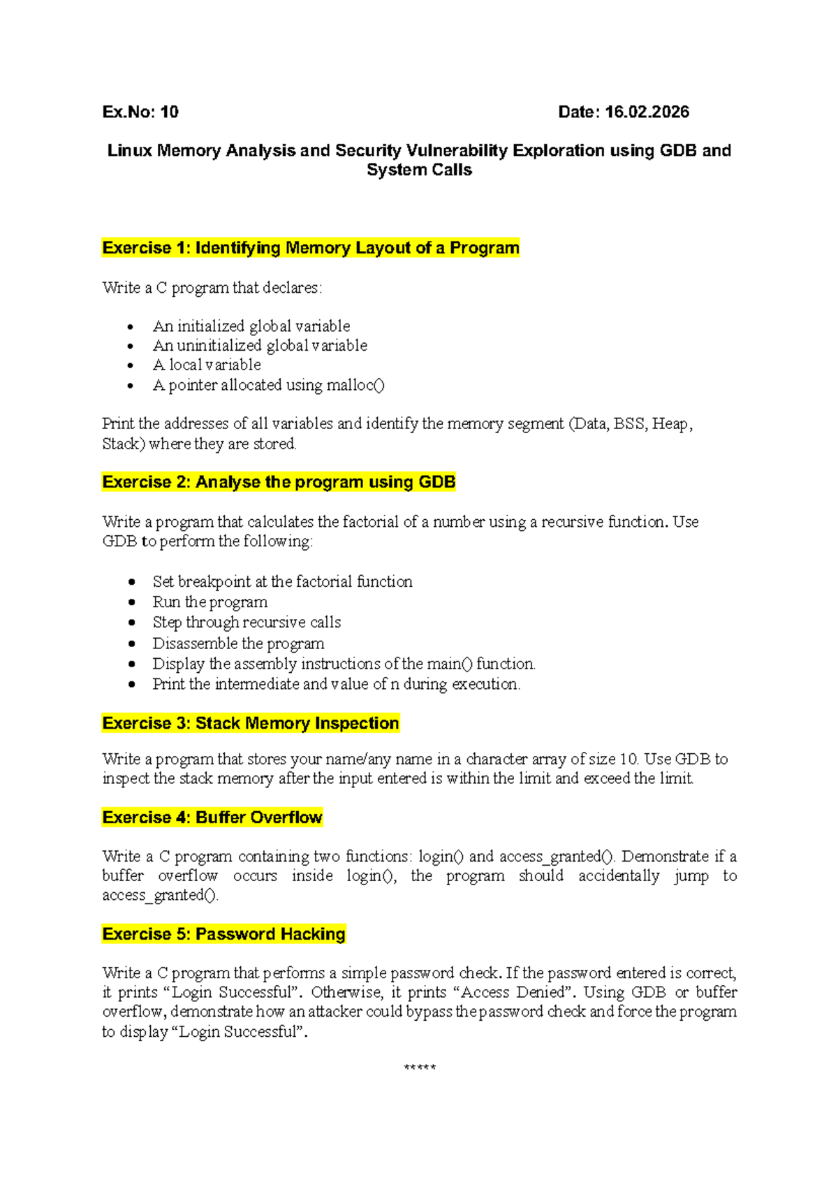Ex.No: 10 - Linux Memory Analysis & Vulnerability Exploration - Studocu