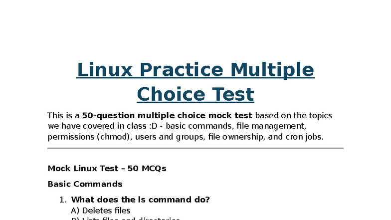 Linux Practice MCQ Test: Basic Commands, Permissions & Cron Jobs - Studocu