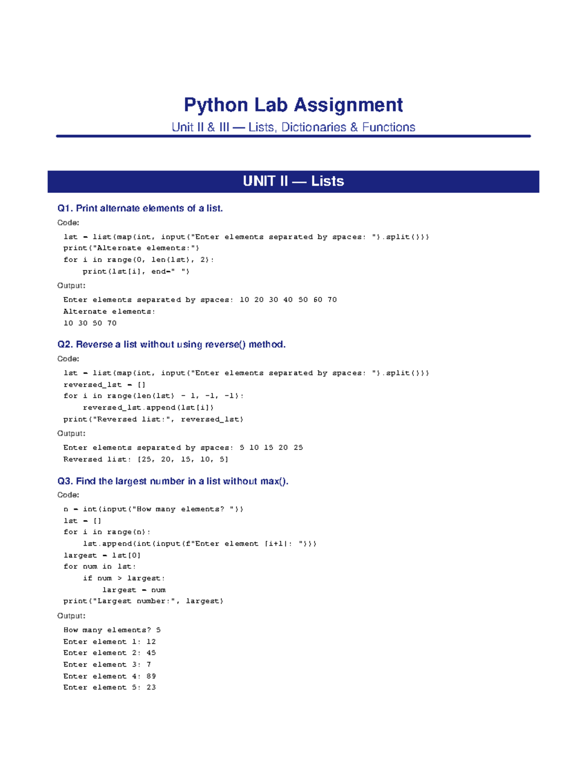 Python Lab Assignment II: Lists, Dictionaries & Functions - Studocu