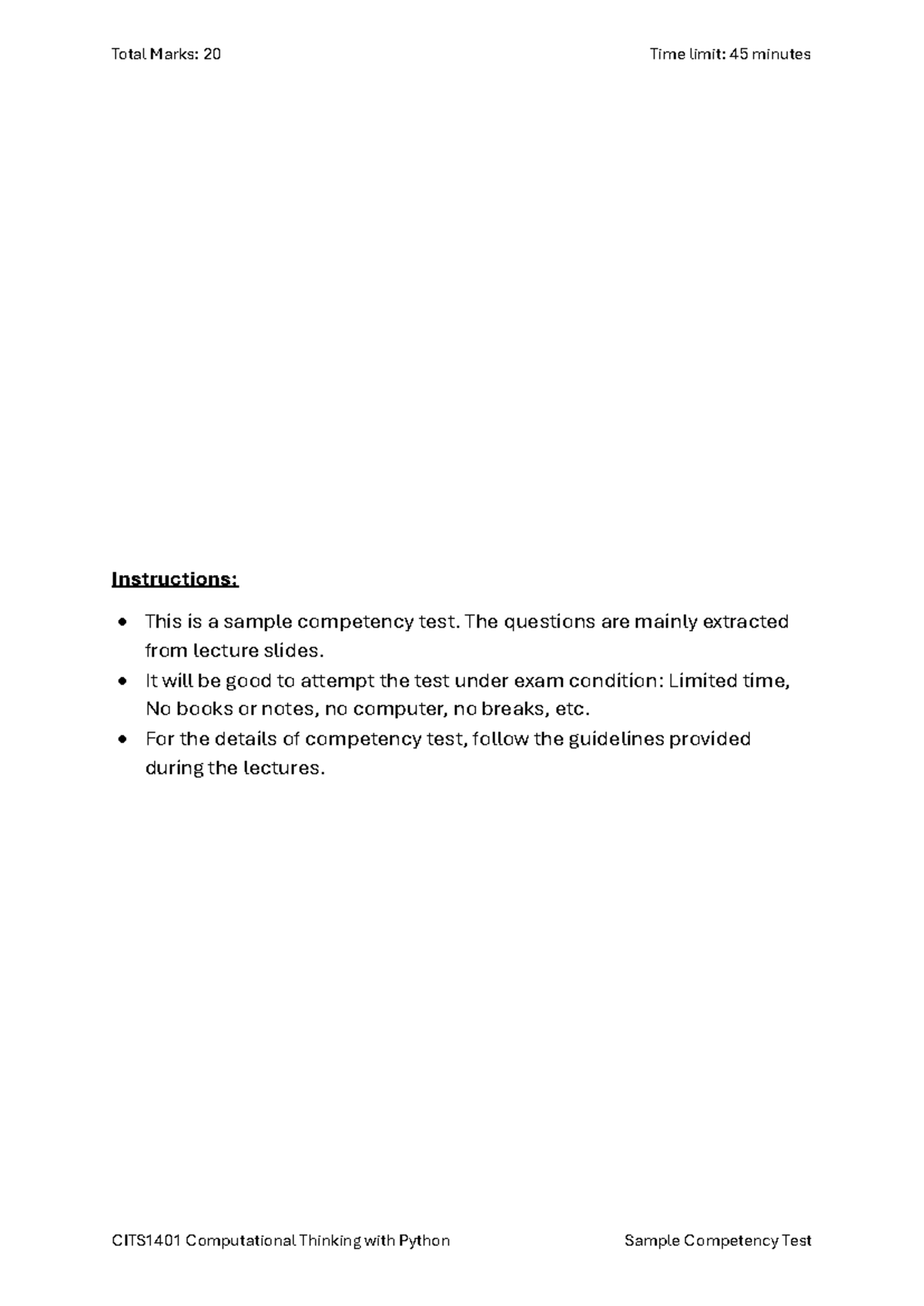 CITS1401 Sample Competency Test: Computational Thinking in Python - Studocu