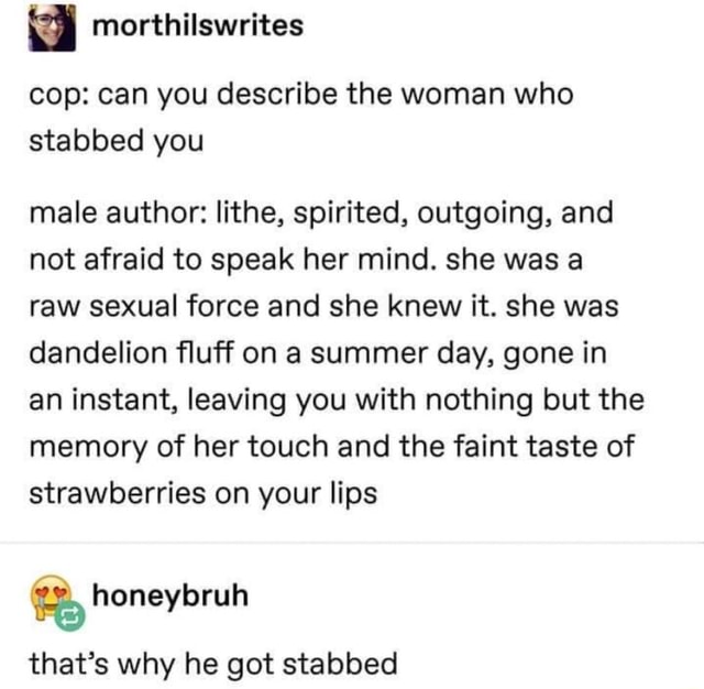 Morthilswrites cop: can you describe the woman who stabbed you male ...