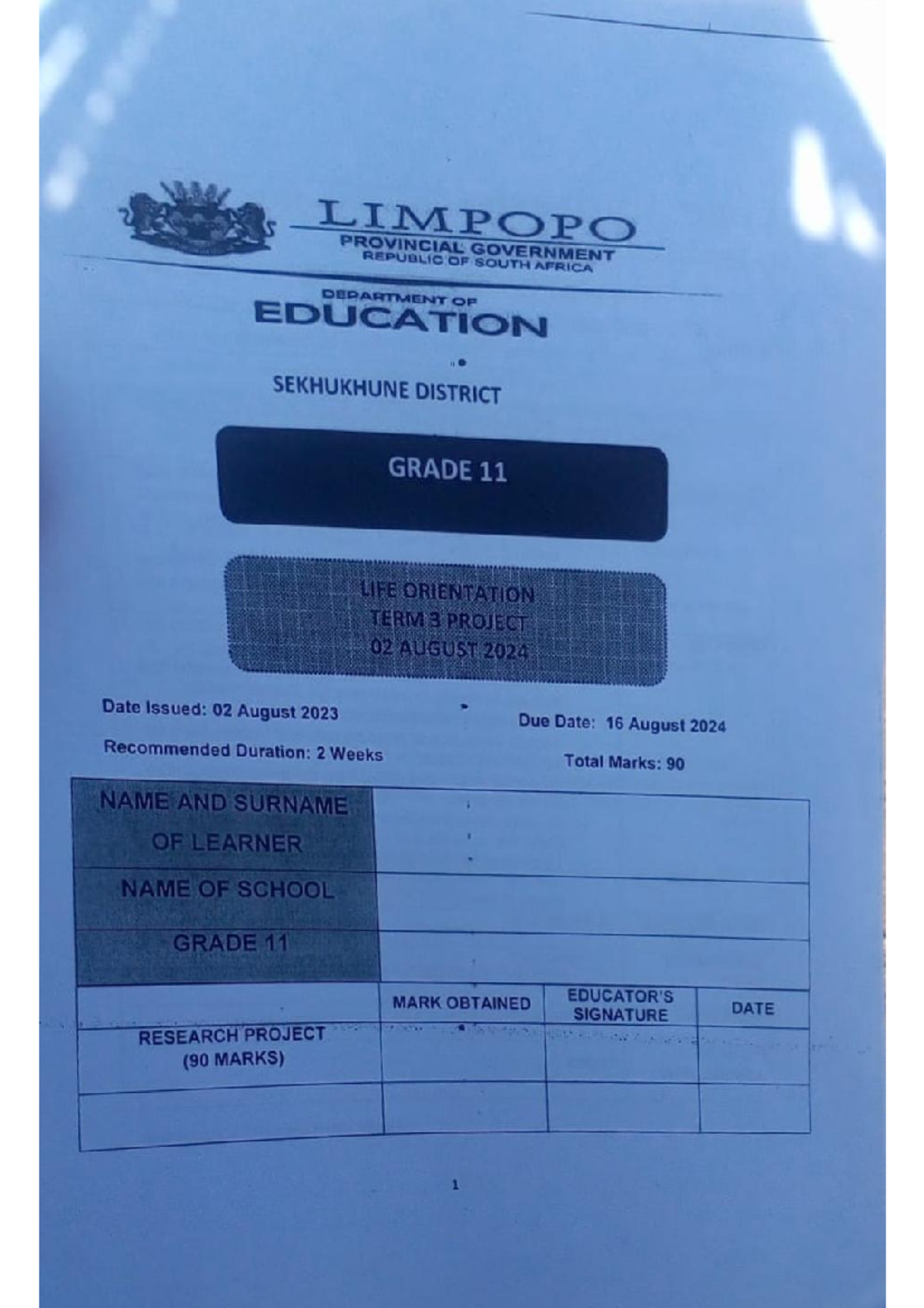 Term 3 project for life orientation grade 11 - Grade 11 Project Teacher ...
