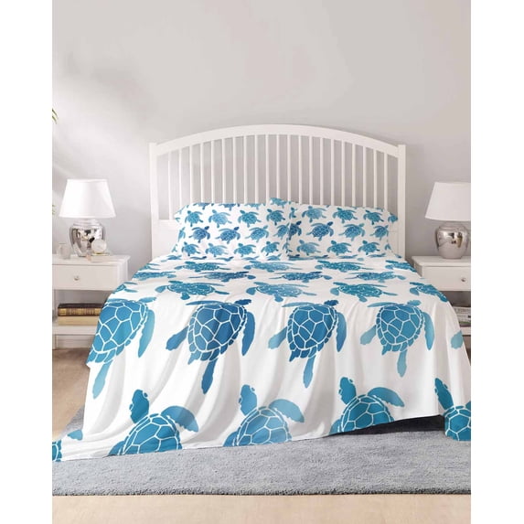 4 Piece Queen Sheet Set Blue Coastal Turtle Sheets Set for Queen Size ...