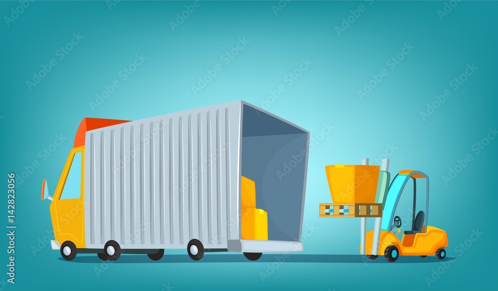 Loading truck and working forklift. Cartoon vector illustration. Stock ...