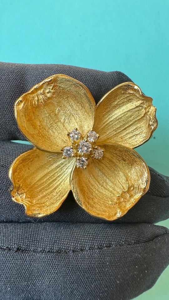 $11500 TIFFANY & CO DOGWOOD .33 DIAMOND FLOWER 18K YELLOW GOLD ENAMEL ...