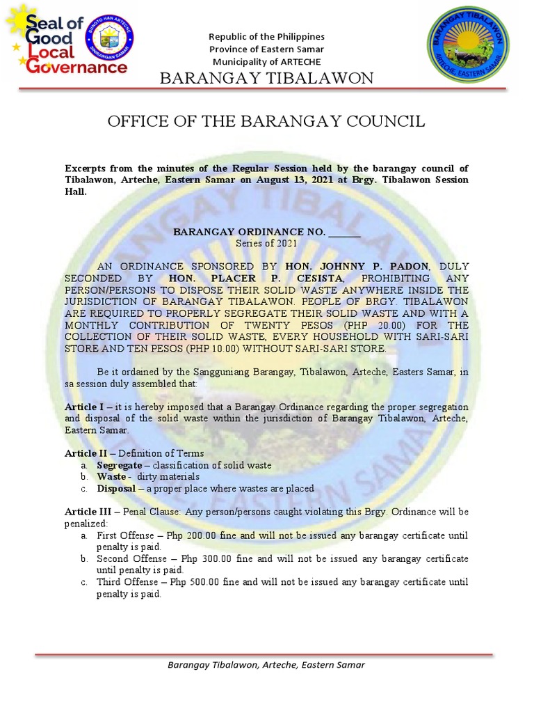 1 Proposed Ordinance 2021 - Republic of the Philippines BARANGAY ...