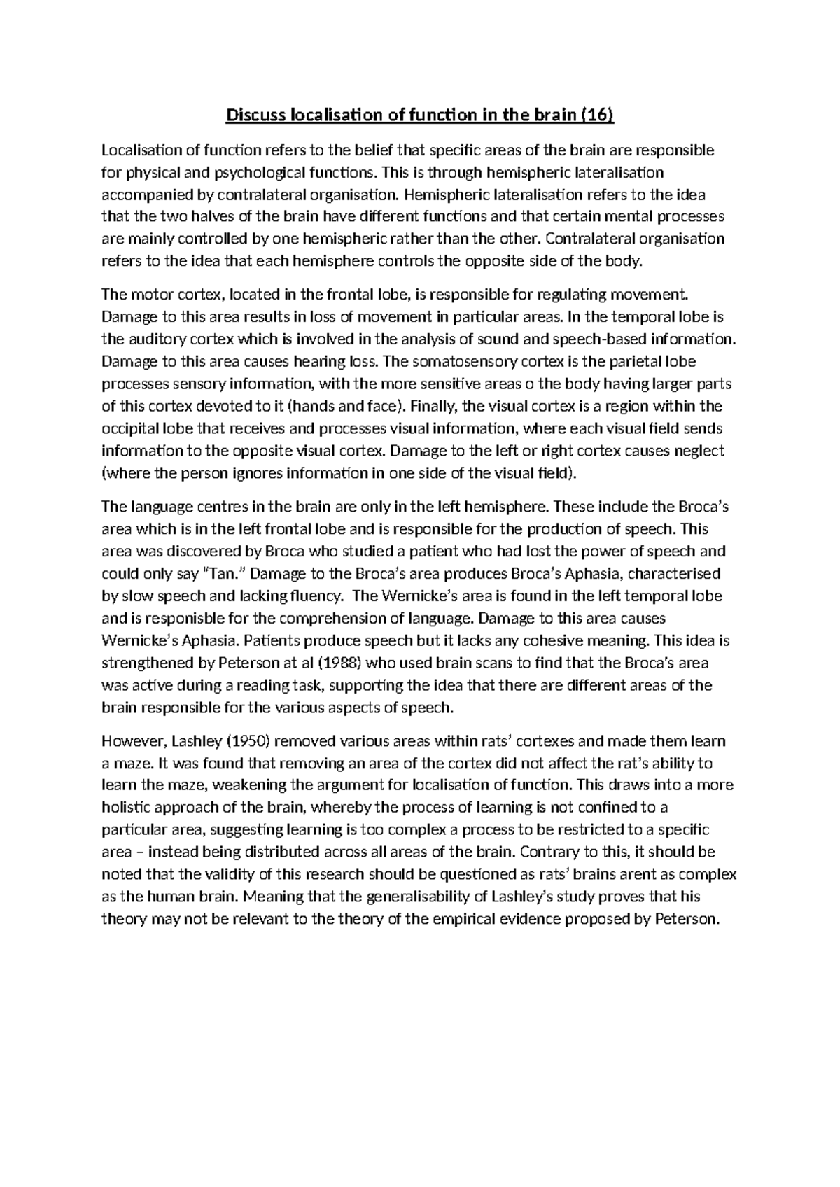 Biopsychology Essay Plan: Localisation of Brain Function Discussion ...