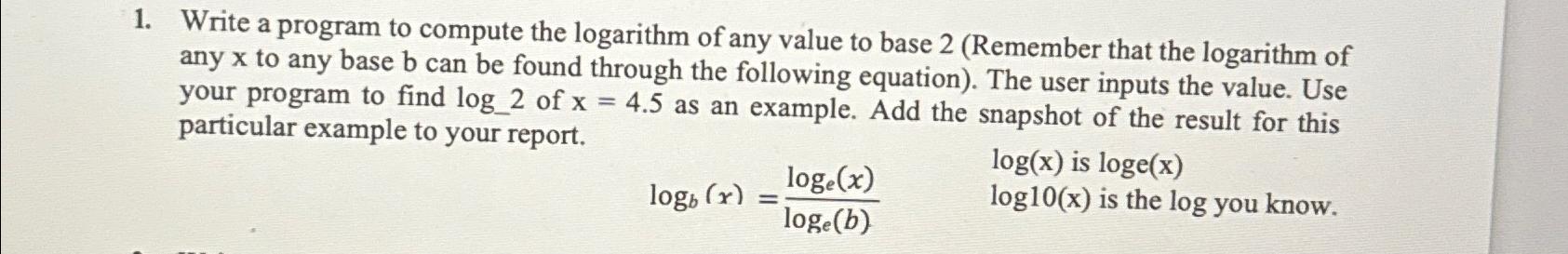 Solved Write a program to compute the logarithm of any value | Chegg.com