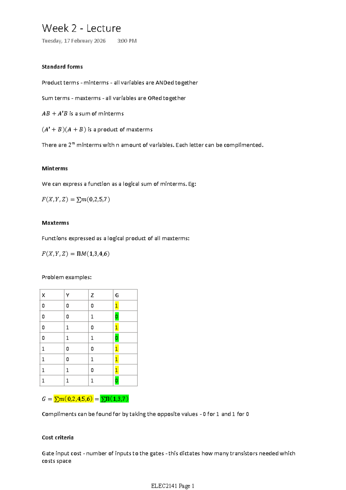 ELEC2141 Week 2 Lecture Notes on Logic Functions and Verilog - Studocu