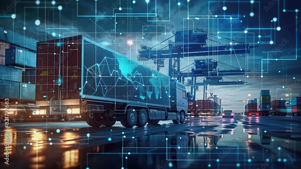 Global logistics with semi-truck, cargo ship docked at port and ...