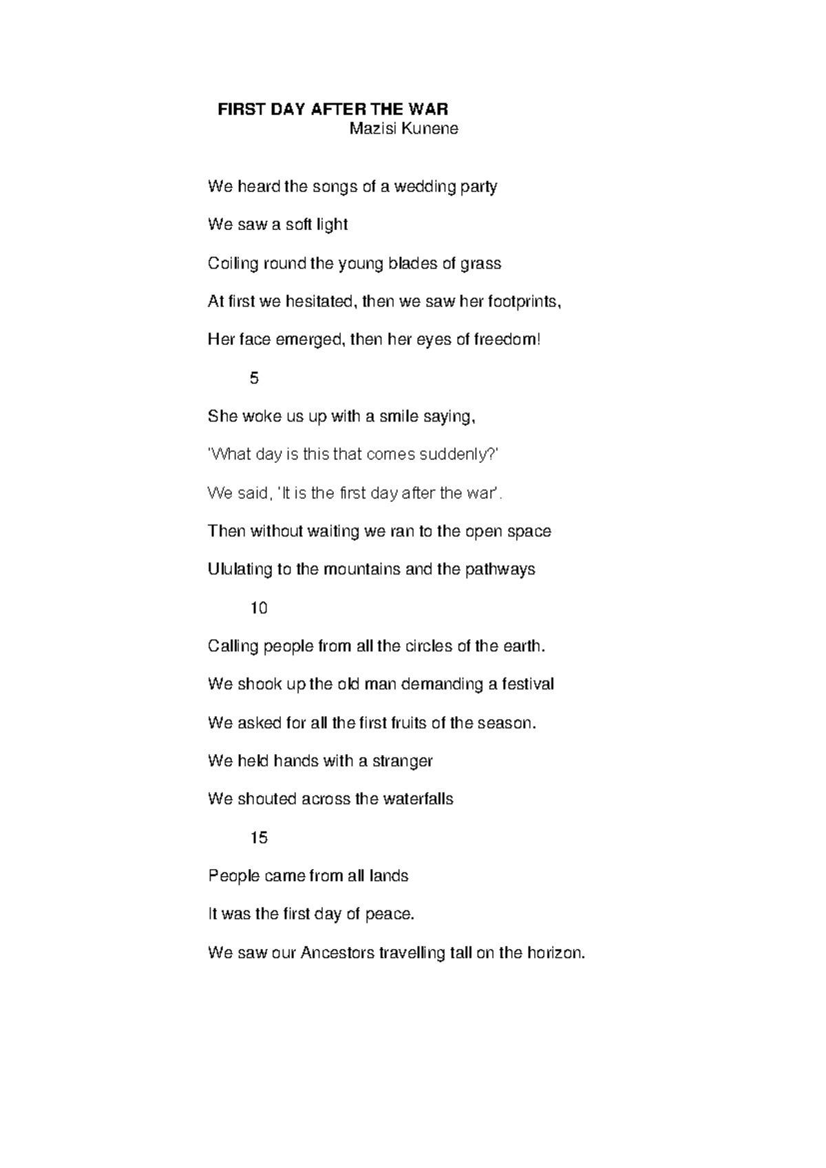 Analysis of Mazisi Kunene's Poem "First Day After the War" - Studocu