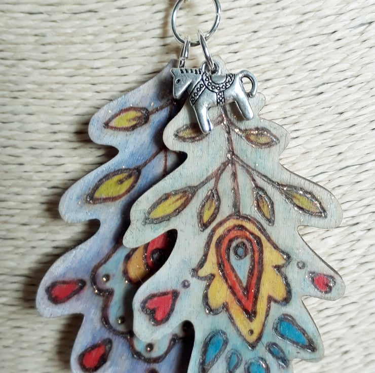 Long Folk art pyrography wooden oak leaf and ti... - Folksy