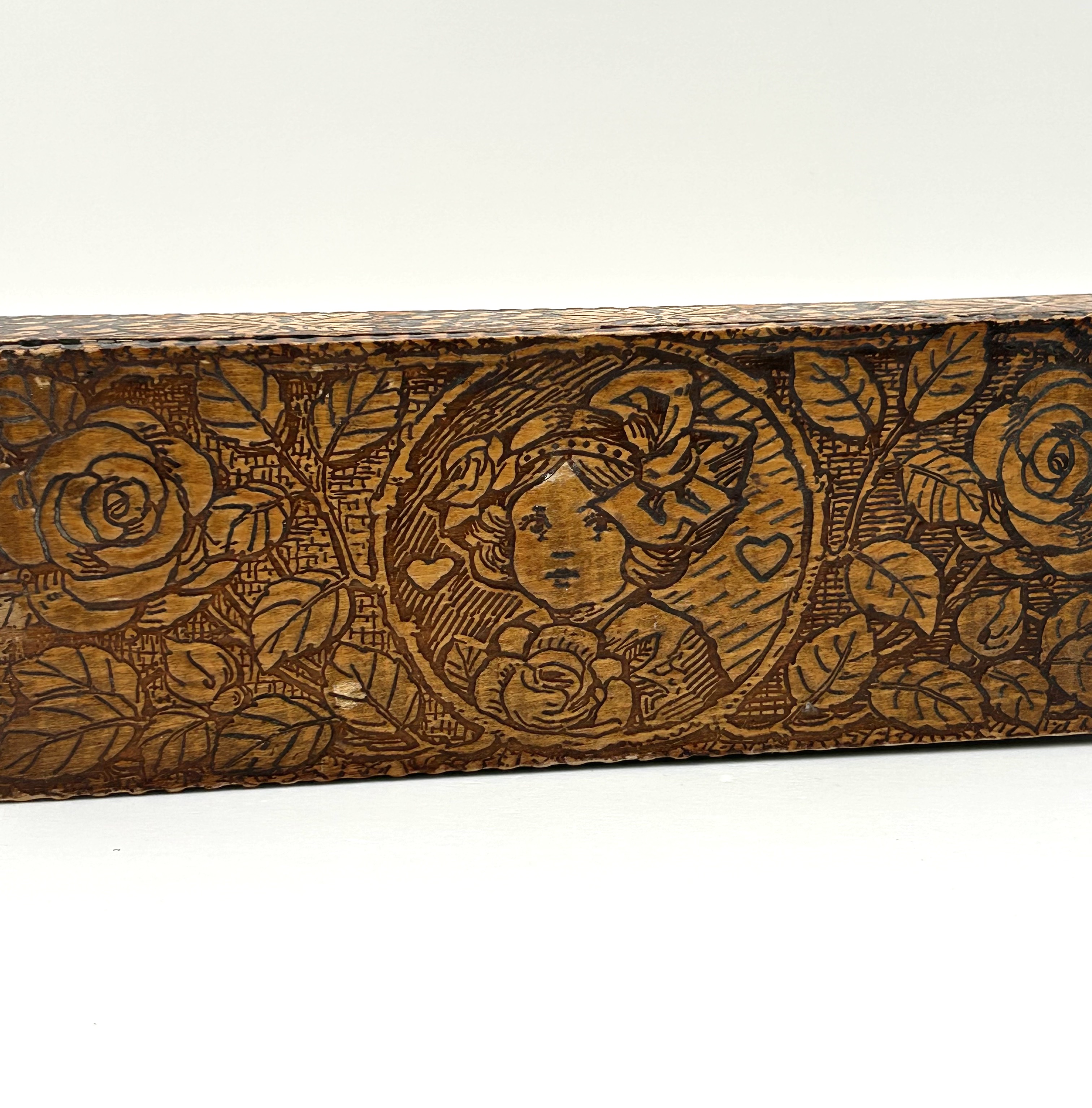 Antique Long Pyrography Carved Wood Burned Box with Floral Ball Feet