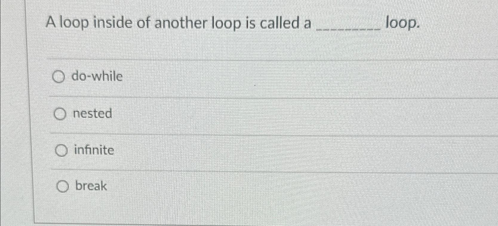 Solved A loop inside of another loop is called | Chegg.com