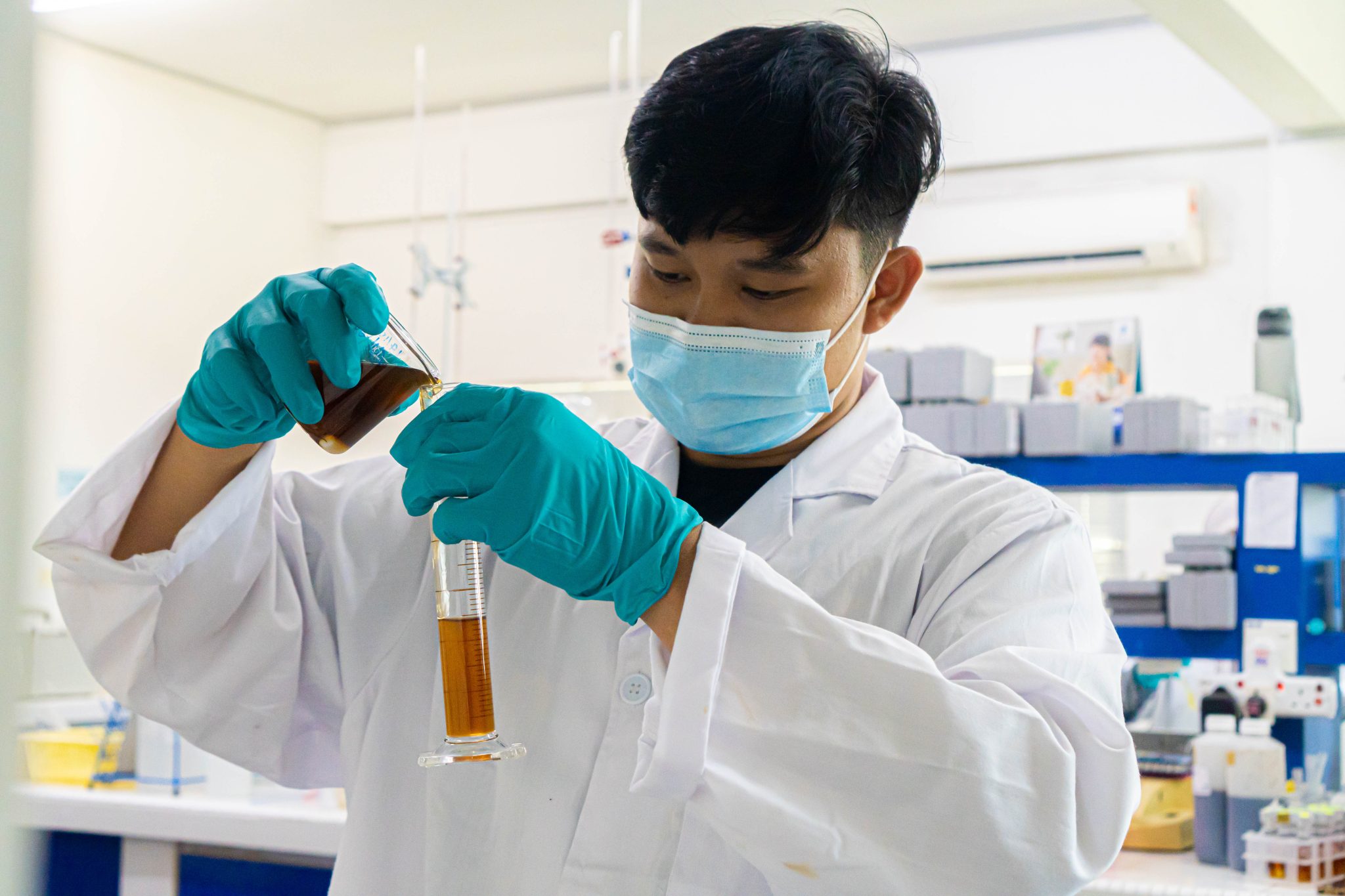 Male scientist researcher, wearing lab coat, white medical gloves, mask ...